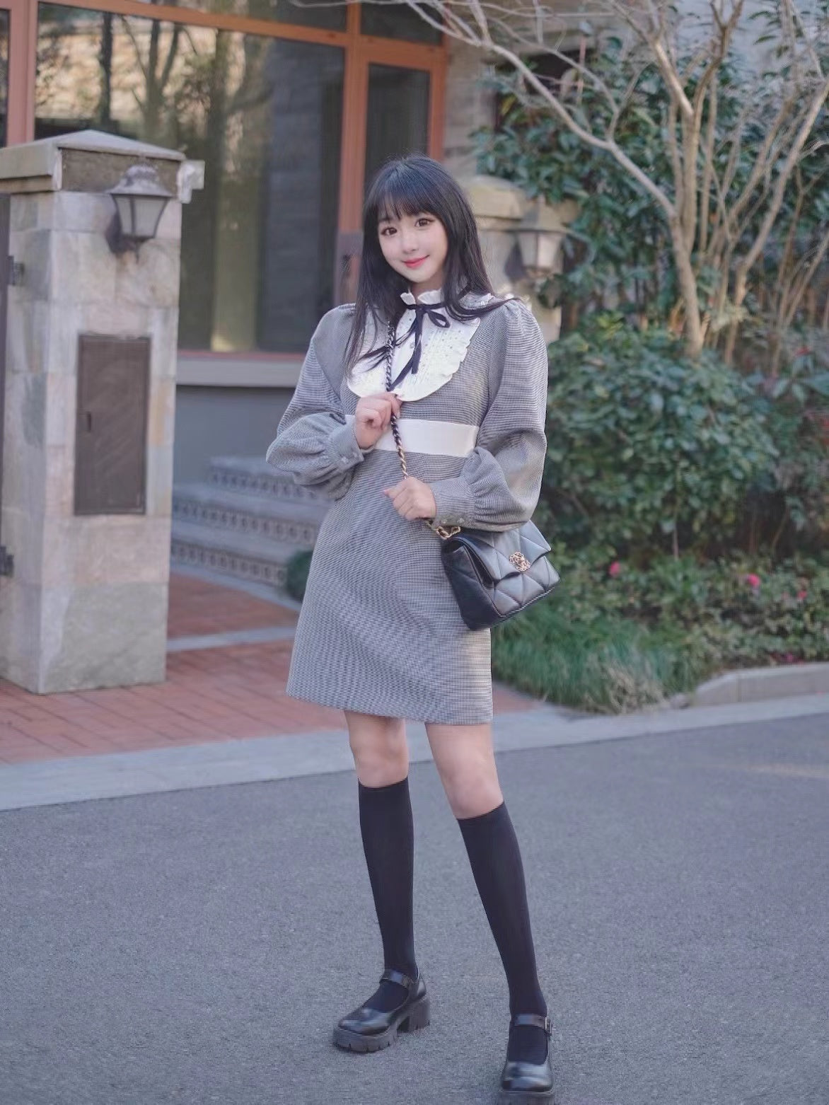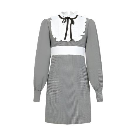 2025BF_ June Eleven Grey Stand Collar Dress With Black Ties