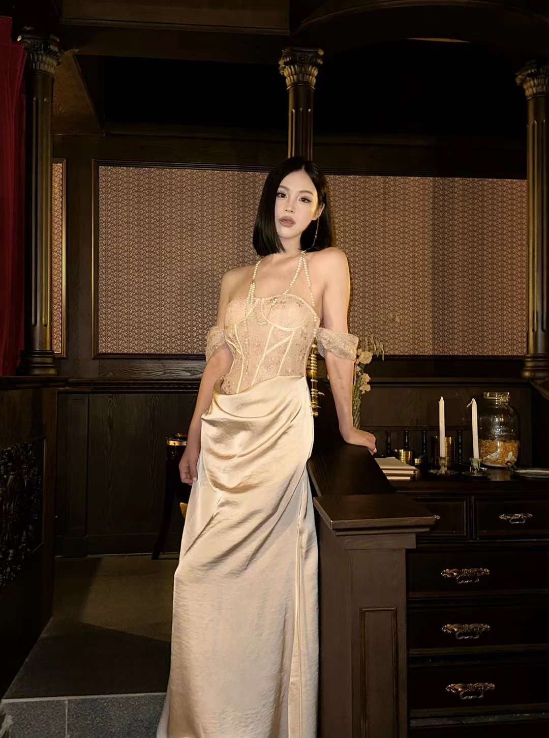 Crow Crew Off-Shoulder Sheer Corset Midi Dress Dusty Pink