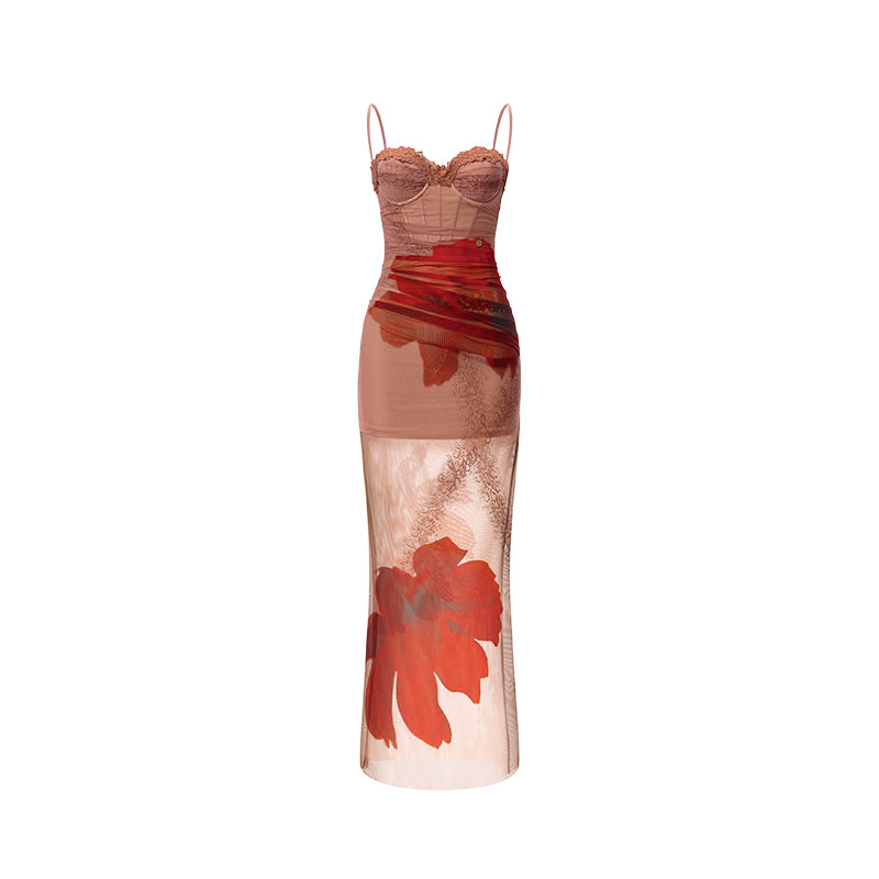 Sheer Luck Floral Bloom Mesh Corset Maxi Dress - Red