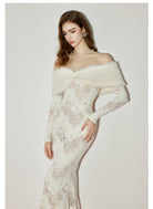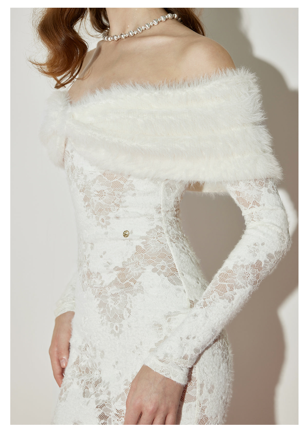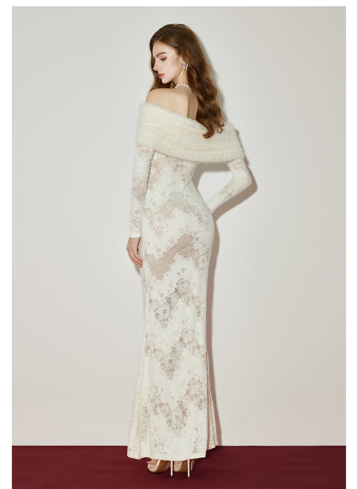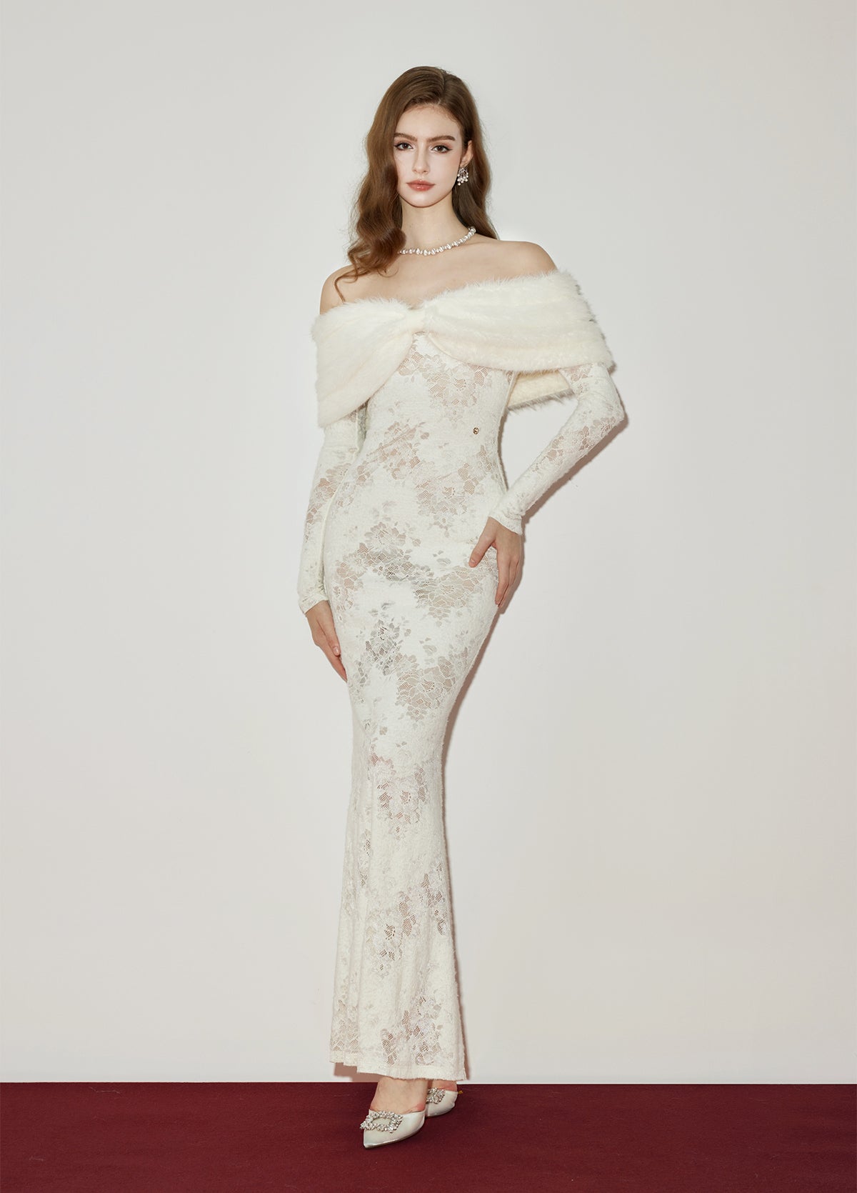 Sheer Luck Cynthia Faux Fur Off-Shoulder Lace Maxi Dress - Ivory