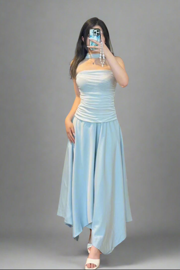 MS Ruched Halter Midi Dress Ice Blue