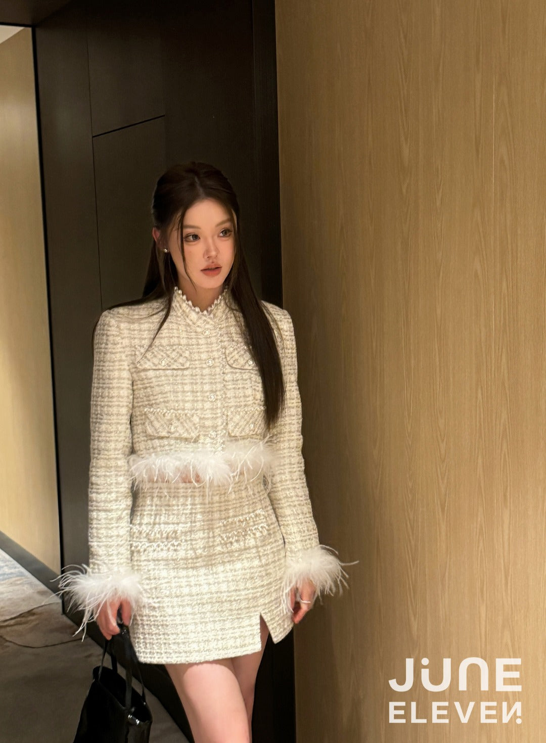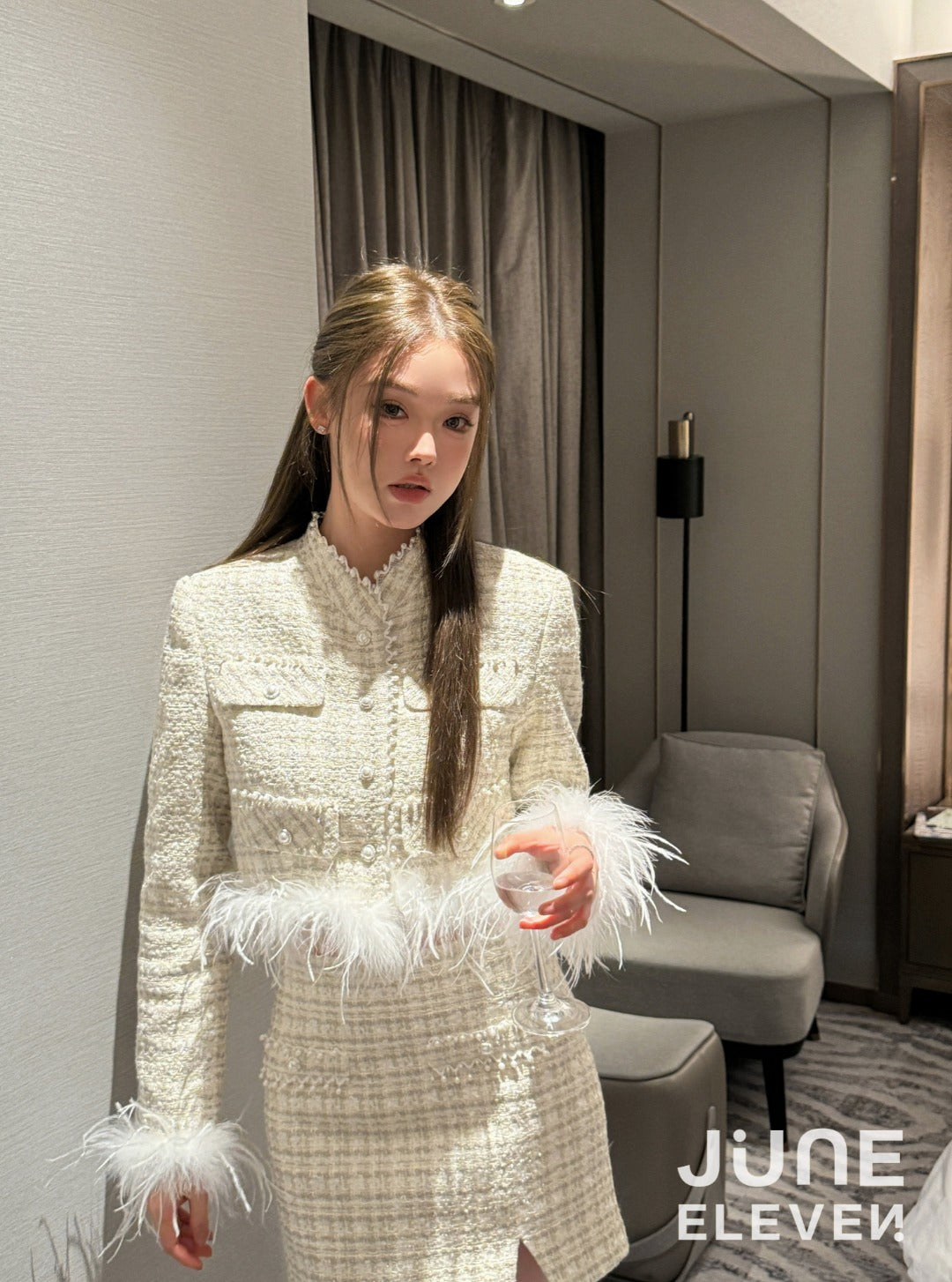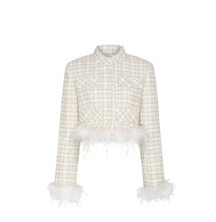 June Eleven Tweed Detachable Feather-Trim Jacket - Cream