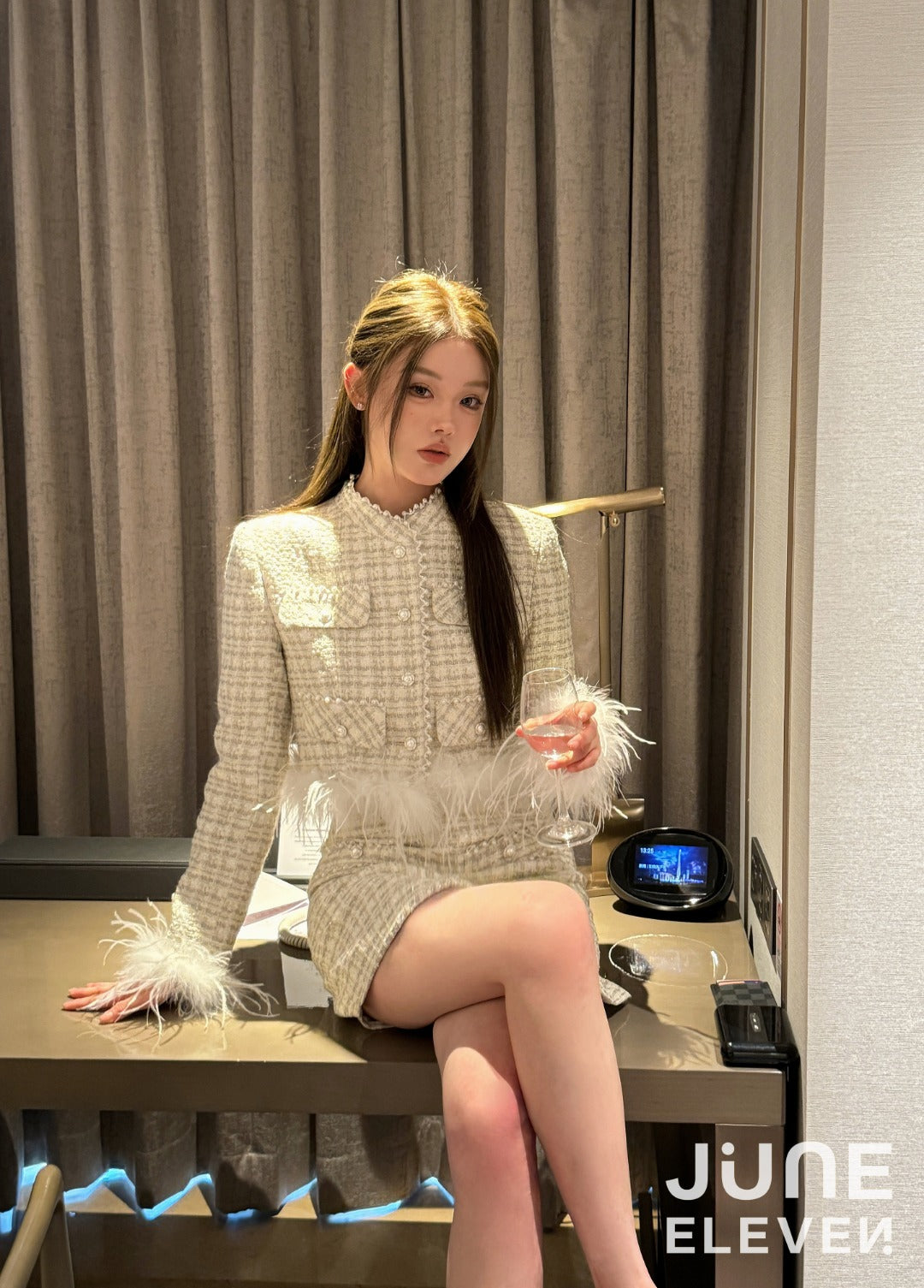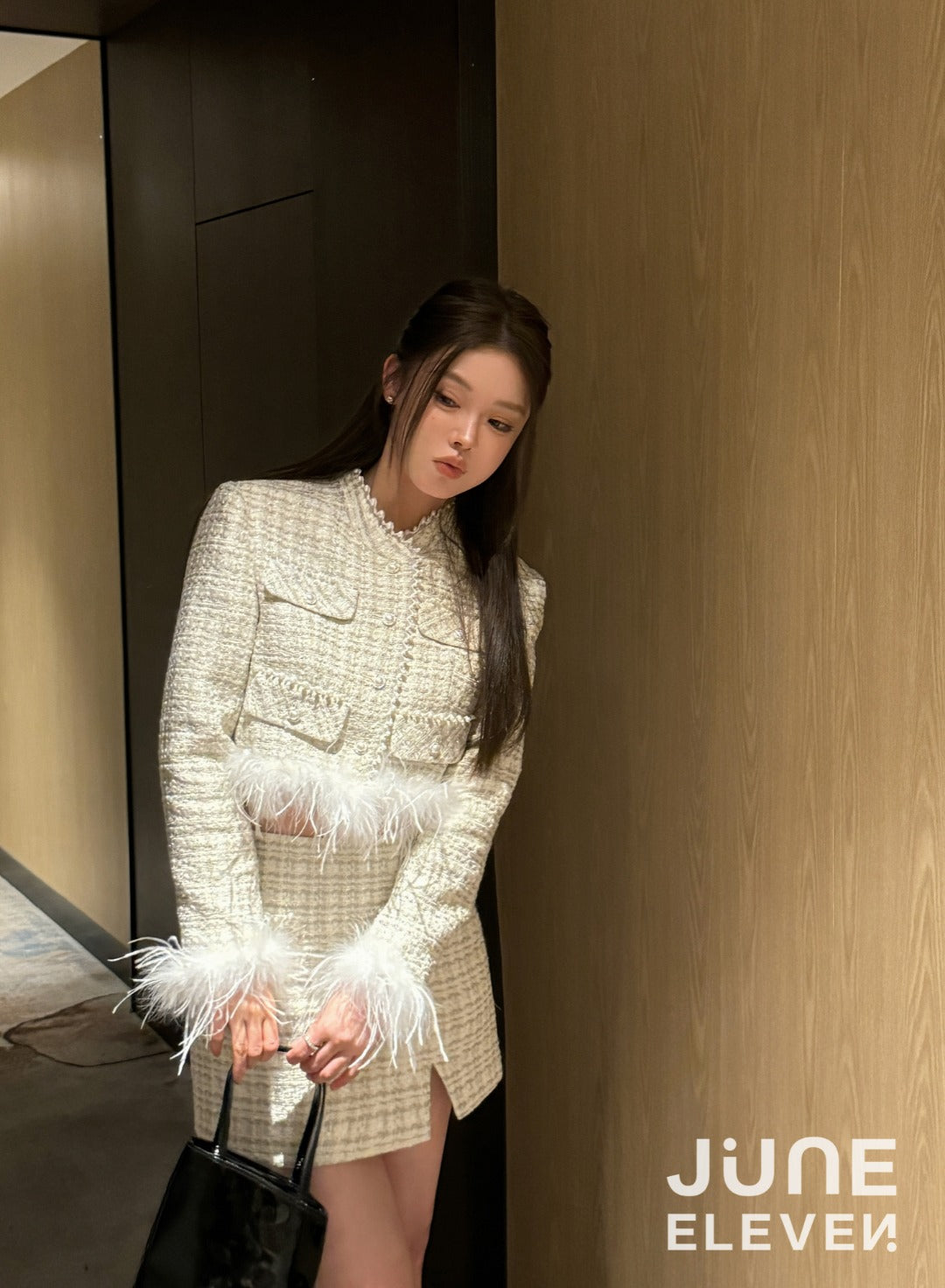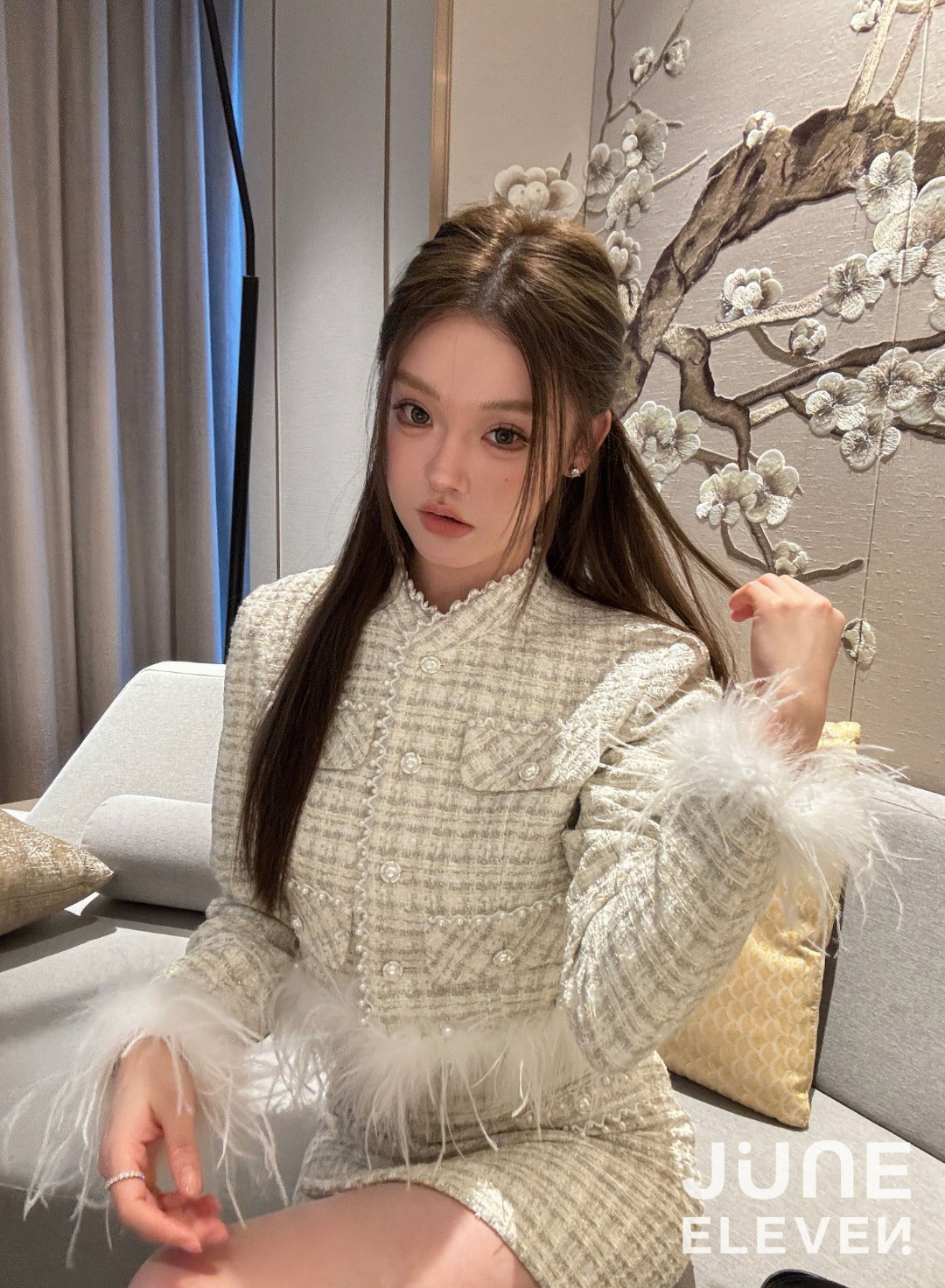 June Eleven Tweed Detachable Feather-Trim Jacket - Cream