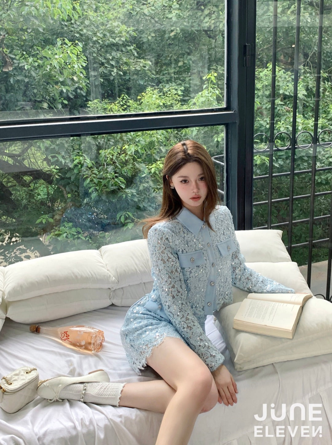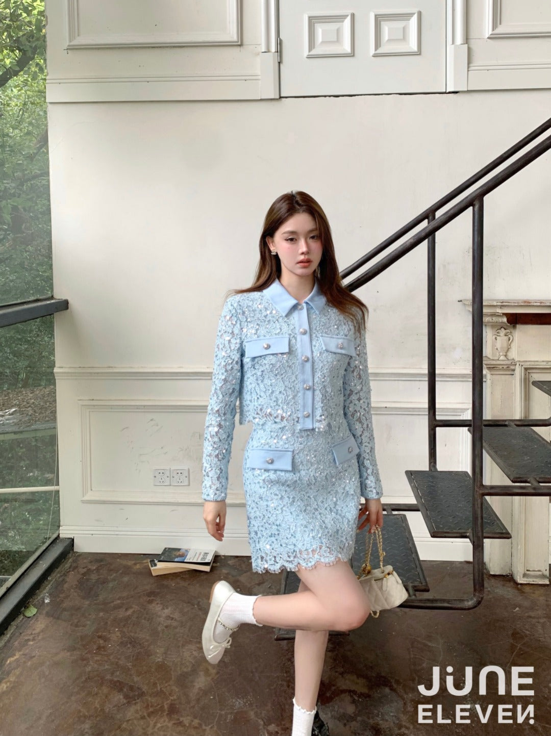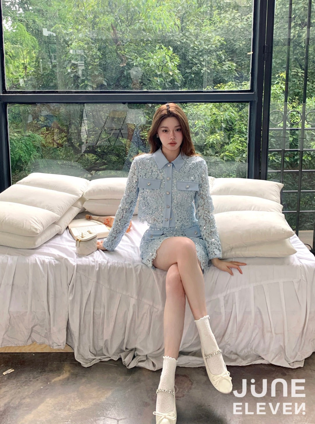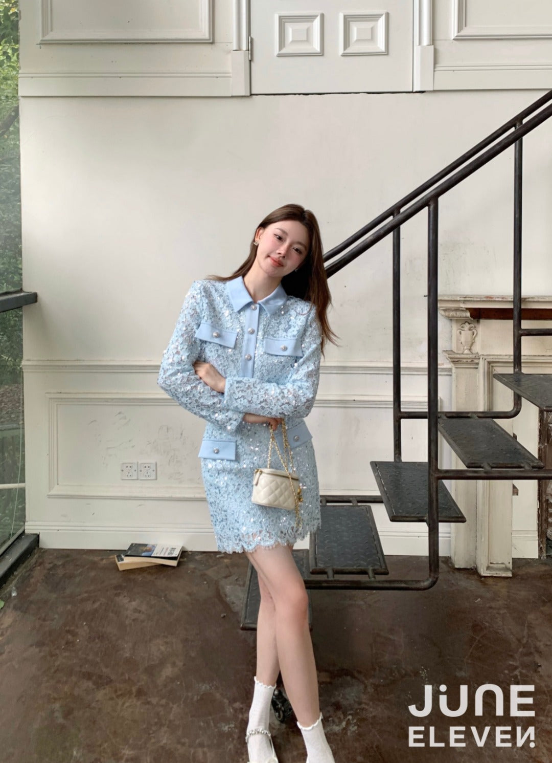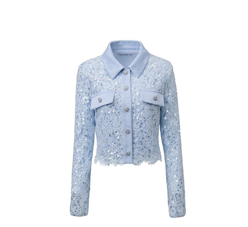 June Eleven Sequin Lace Jacket Top - Baby Blue