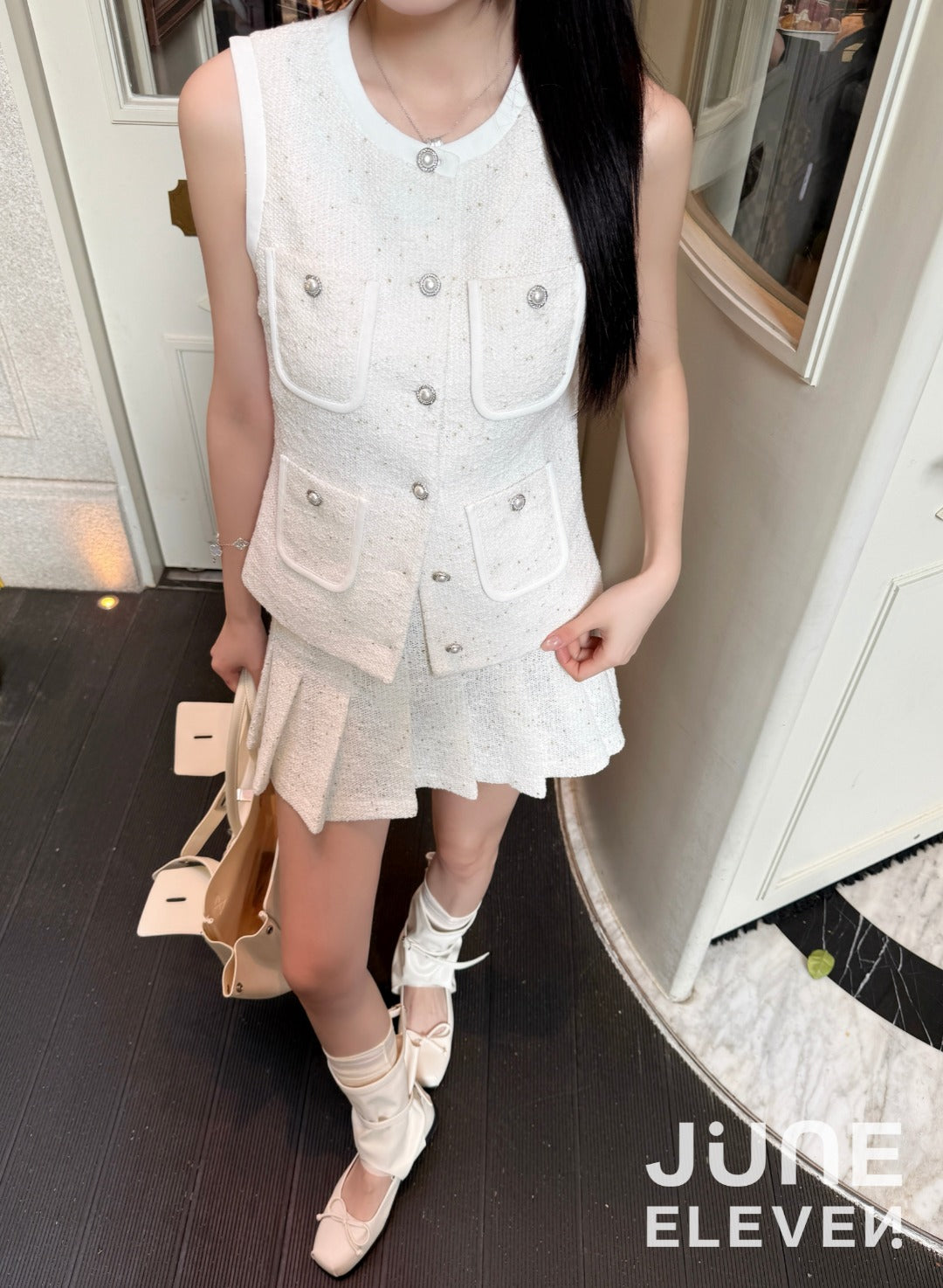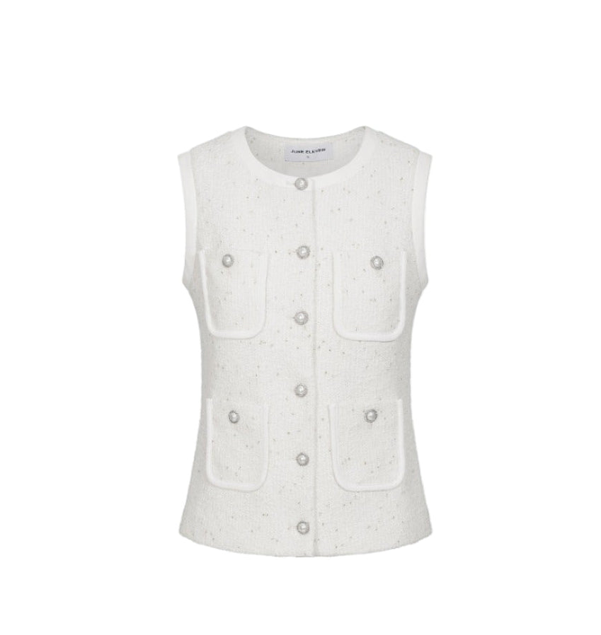 June Eleven Tweed Pearl-Button Vest - Ivory