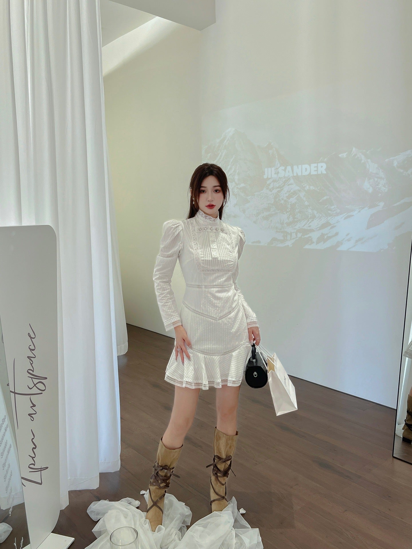 June Eleven Sequin Floral Puff Sleeve Mini Dress Cream