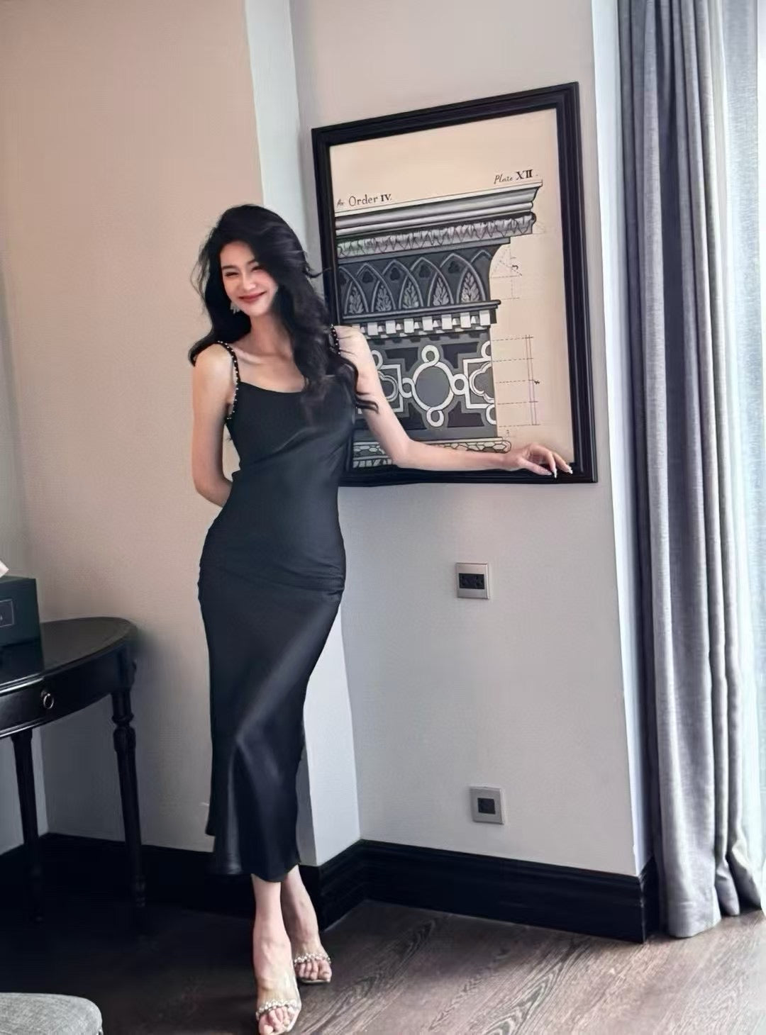 Moon&Sea Braided Strap Satin Midi Dress Black