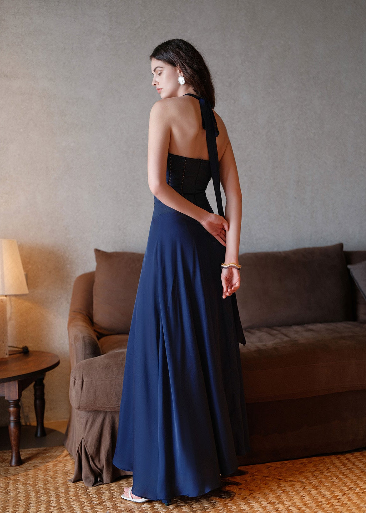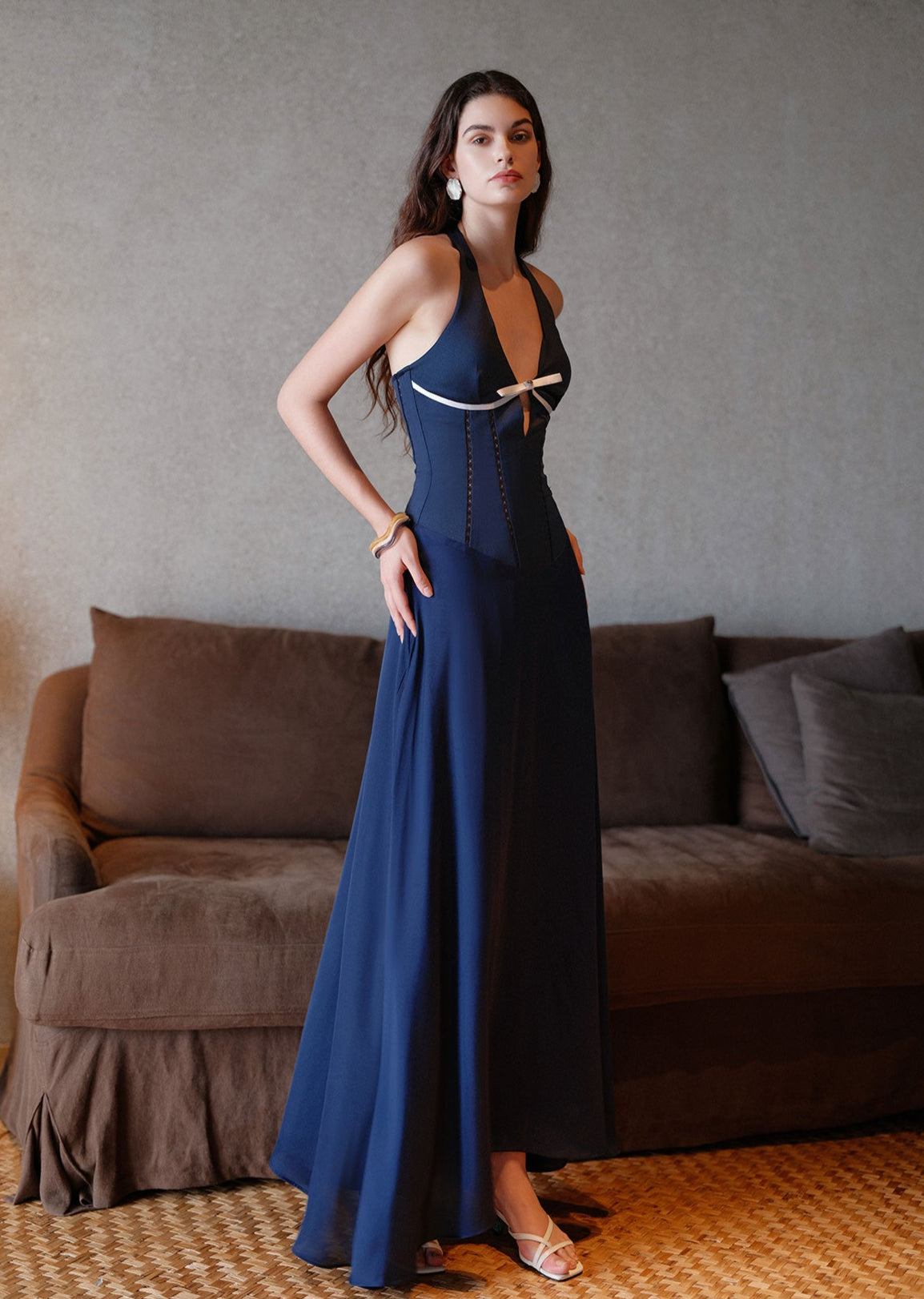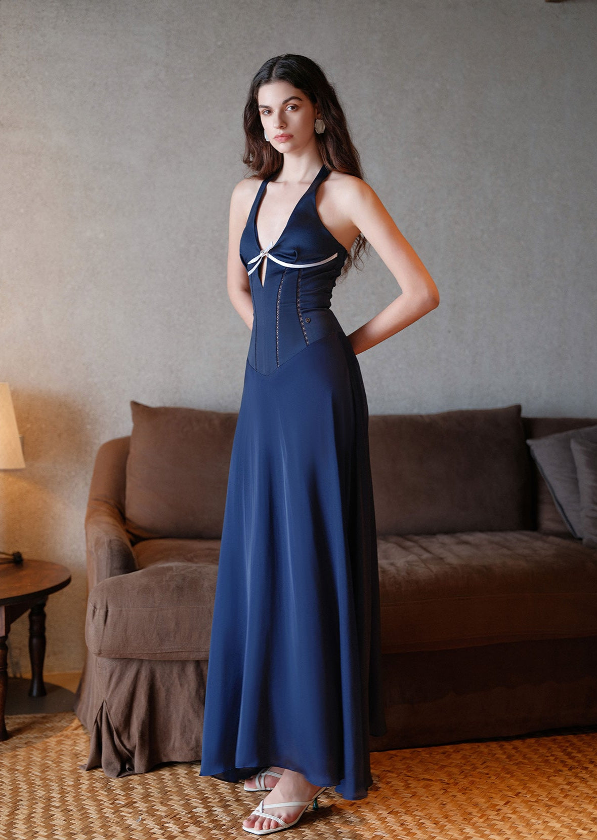 Sheer Luck Tasman French V-Neck Hollow-Out Halter Midi Dress Midnight Blue