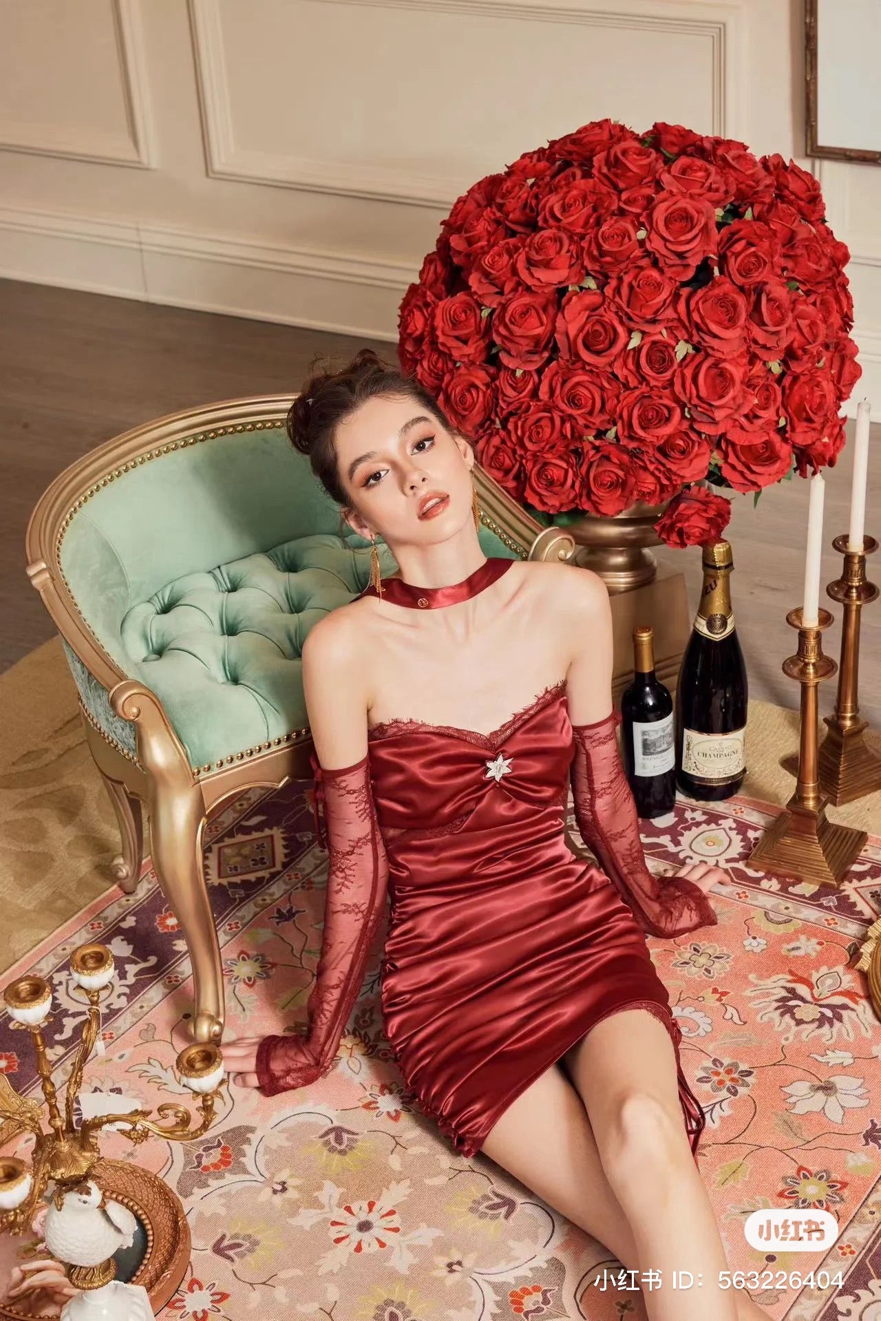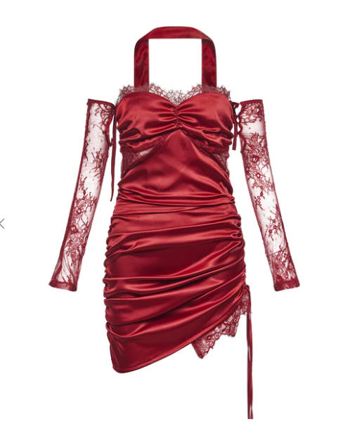 Sheer Luck Satin Mini Dress with Lace Gloves and Satin Ribbons - Red