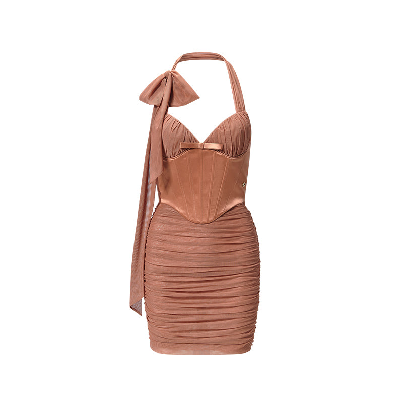 Sheer Luck Rosetta Corset Bow-Tie Mini Dress - Brown