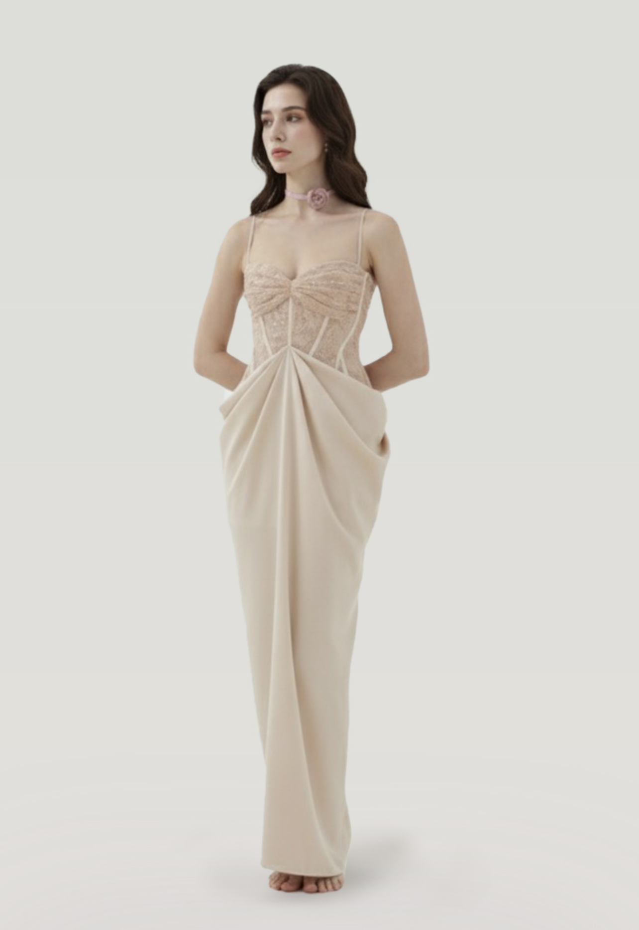 Crow Crew Embroidered Mesh Satin Dress - Nude Pink