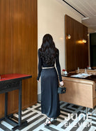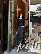 June Eleven Draped Satin Slit Midi Skirt - Black