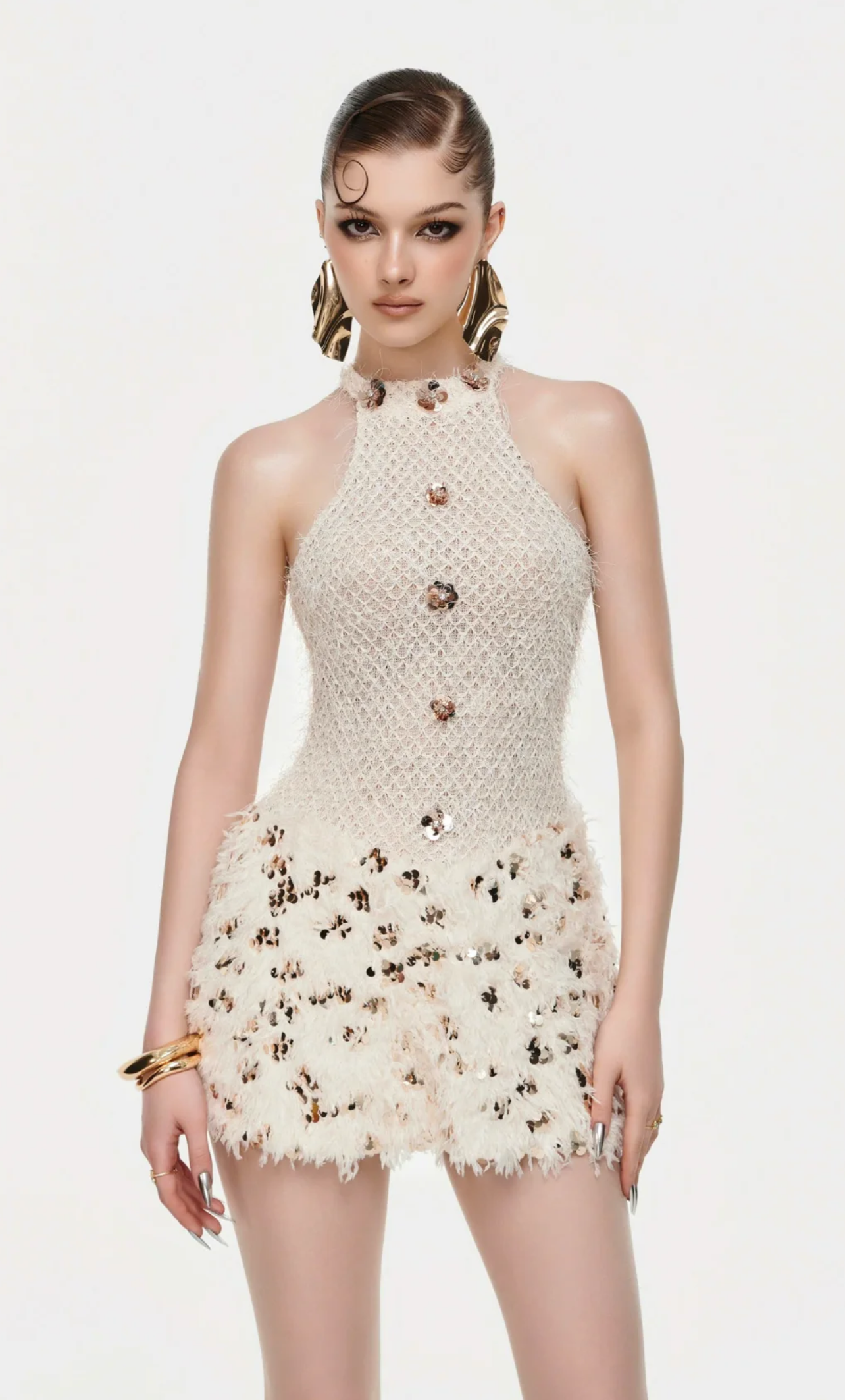Moulinrose Embellished Halter Feather Mini Dress - Ivory