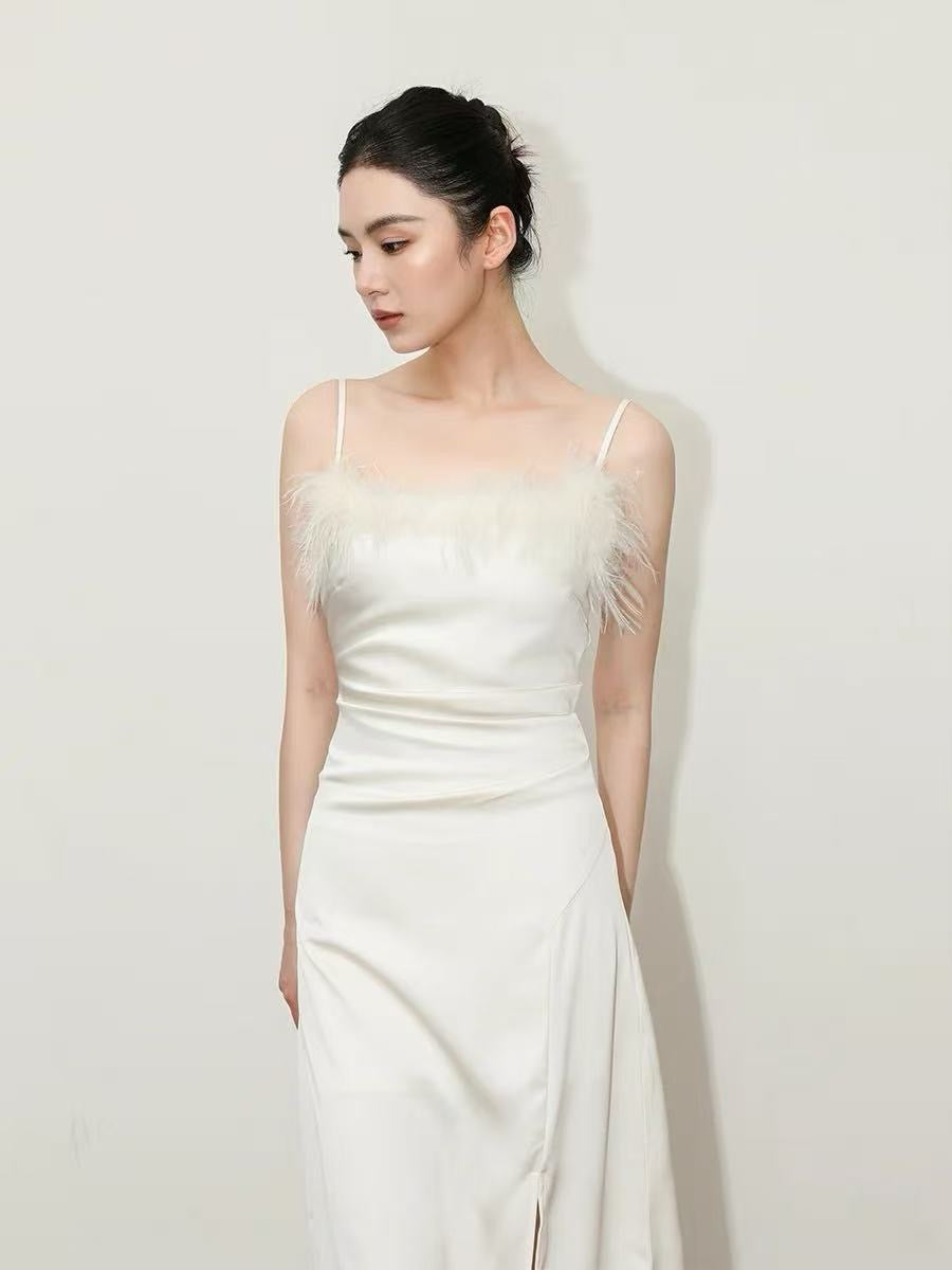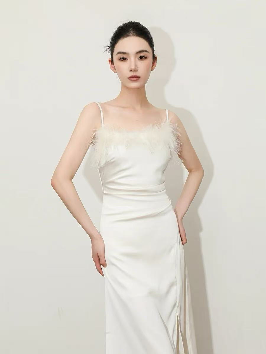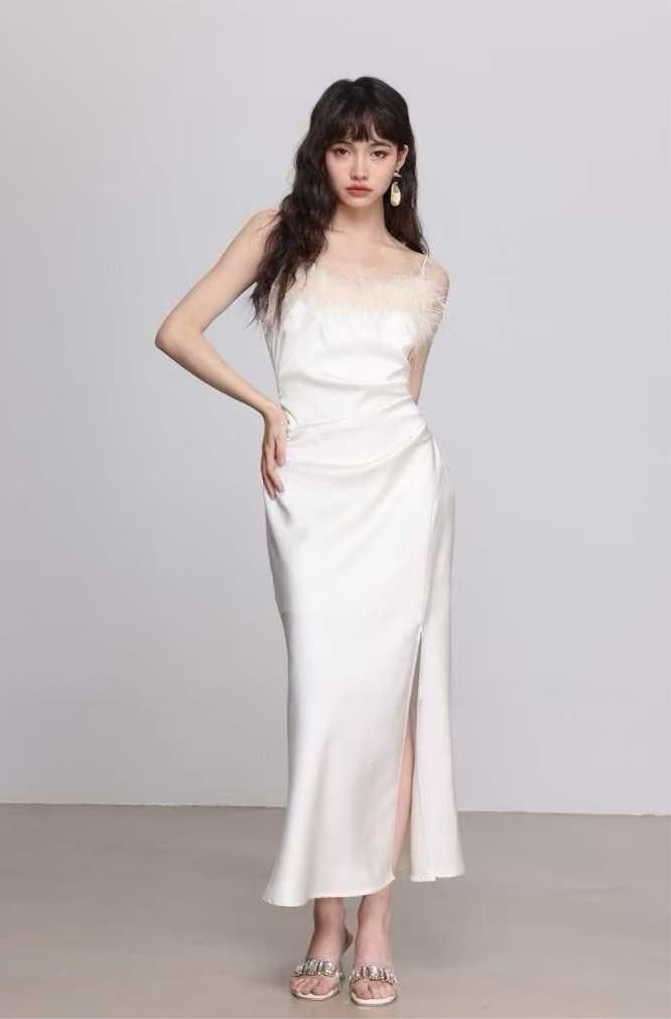 MS Feather-Trim Satin Midi Dress - Ivory