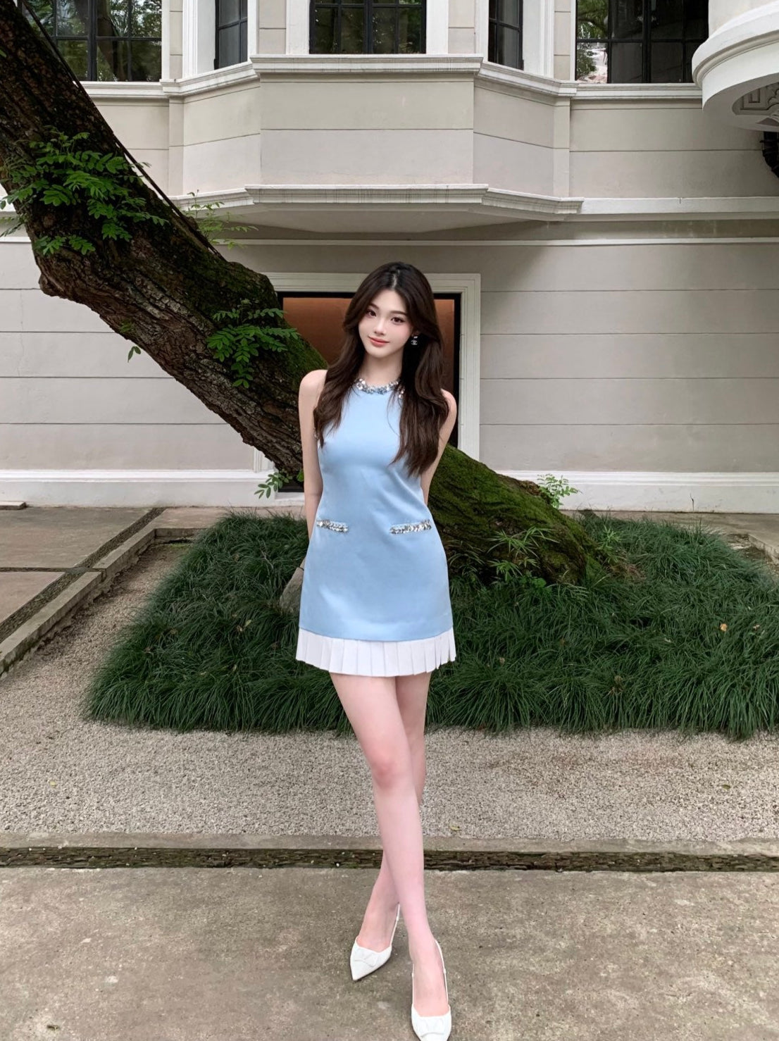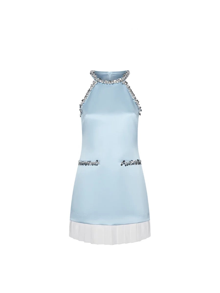 June Eleven Beaded Collar Pleated Hem Mini Dress Blue