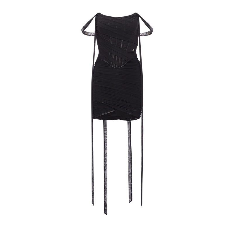 Sheer Luck Nyree Mesh Ribbon Asymmetrical Mini Dress Black