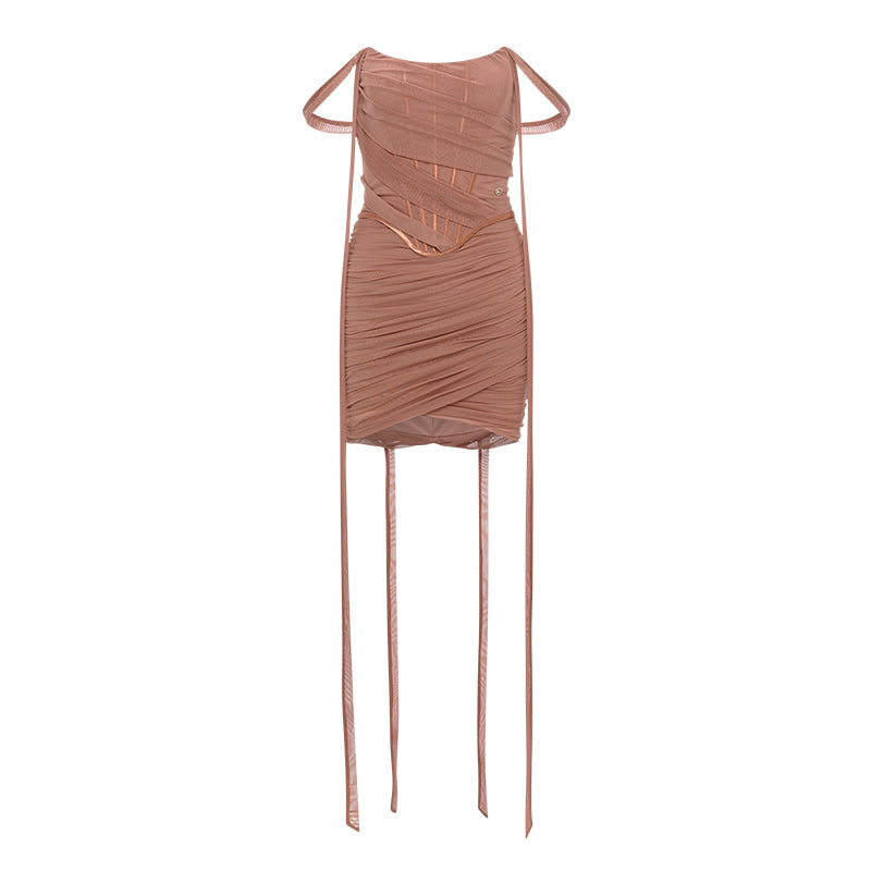 Sheer Luck Nyree Mesh Ribbon Asymmetrical Mini Dress Brown