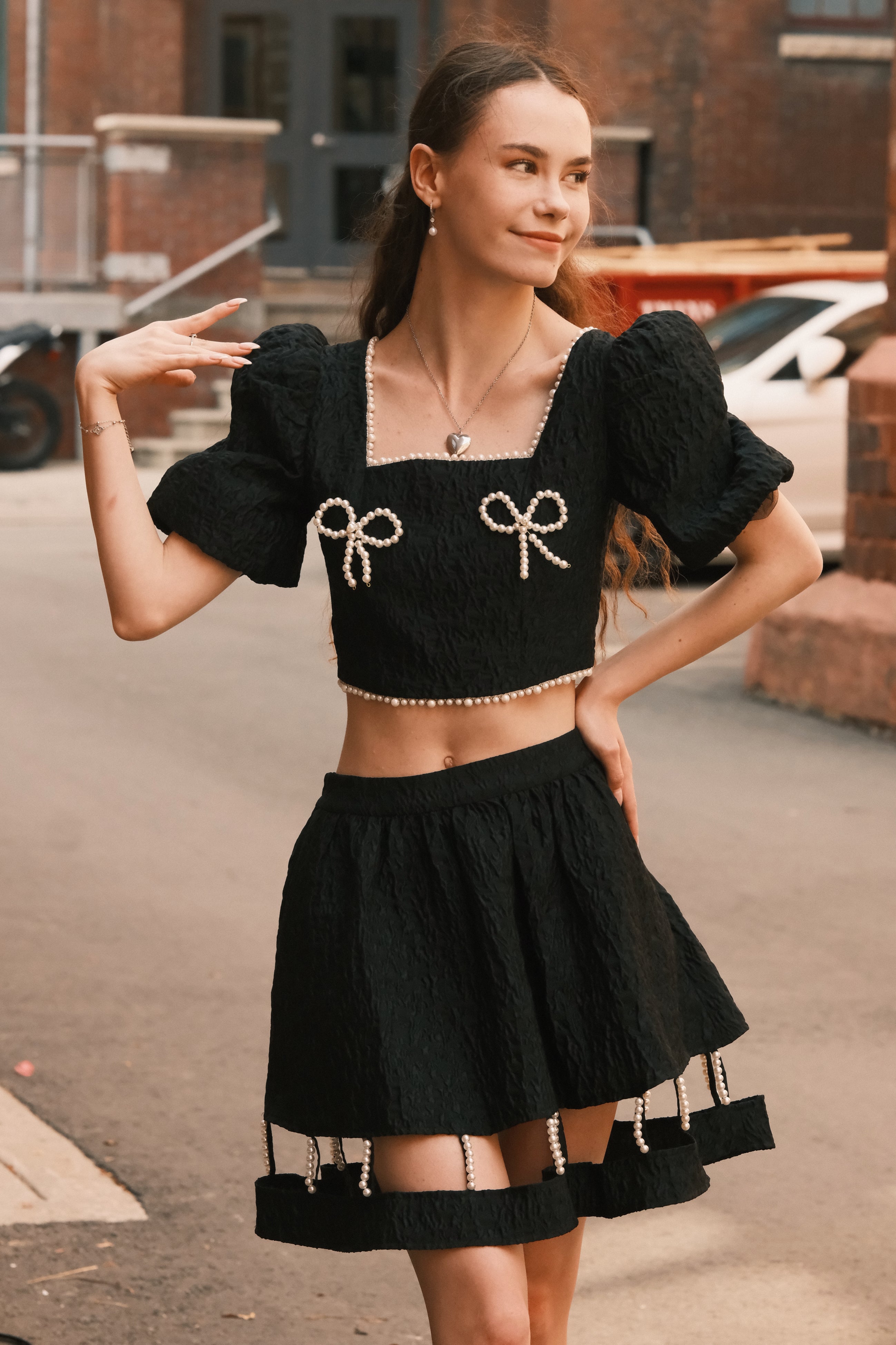 This two-piece set seamlessly blends a smocked crop top featuring elegant puff sleeves with a high-waisted pleated skirt. Delicate pearl beading and bowtie accents trim the edges of both the top and skirt, creating a wonderfully dreamy ensemble. Available in light blue and black.