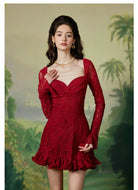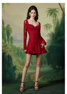 Sheer Luck Laura Lace Long Sleeve Mini Dress - Red